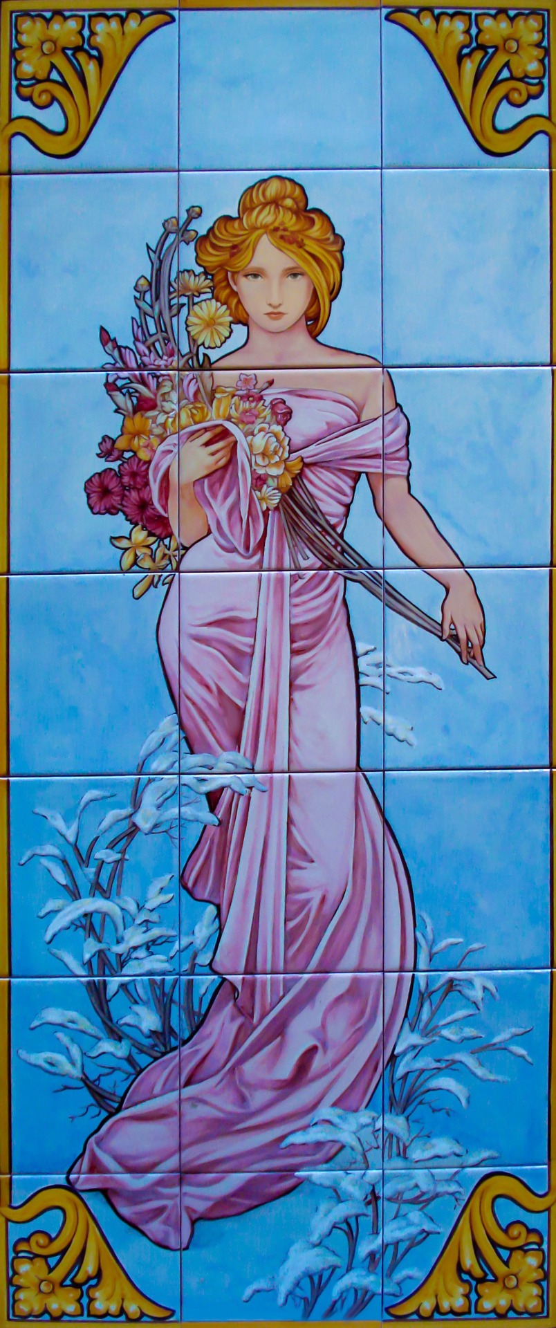 "La Primavera" de Alphonse Mucha es un mural de cerámica que captura la esencia del original, pero con un toque personal distintivo, simplificando algunas formas y enfatizando otras.