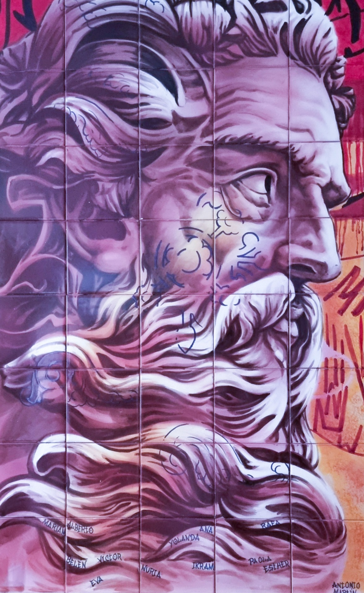 Este mural ofrece una reinterpretación moderna y enérgica de Poseidón, el dios del mar. La obra es un fascinante cruce artístico, donde la maestría clásica (realismo renacentista) se entrelaza con la libertad urbana (texturas de grafiti y colores vivos), creando un impacto visual cautivador. Se trata de un equilibrio sofisticado entre lo antiguo y lo actual, con el uso de detalles en cerámica de Talavera que realzan la riqueza de su paleta de colores vibrantes. Realizado íntegramente a mano durante un curso de cerámica artística, encarna la más pura esencia del trabajo en equipo como un acto creativo. ( Homenaje a Pichiavo)